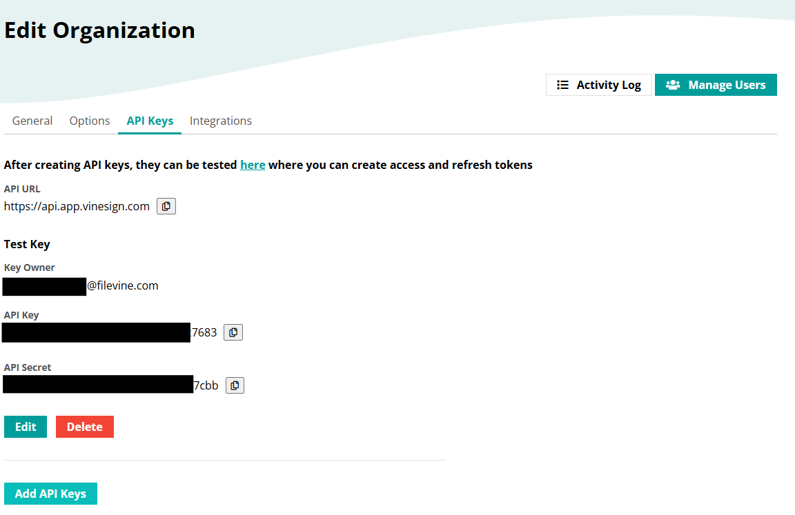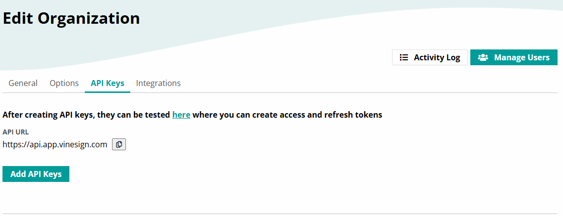 To begin the integration process, sign into the relevant Vinesign account, navigate to Settings, and then select the API Keys tab.