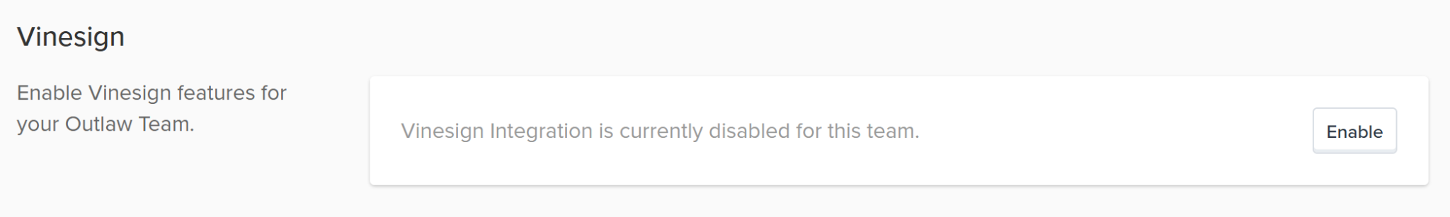 In another browser tab, sign in to Outlaw, then select Team and choose your team name from the drop-down. Select the Integrations tab and click Enable in the Vinesign section.