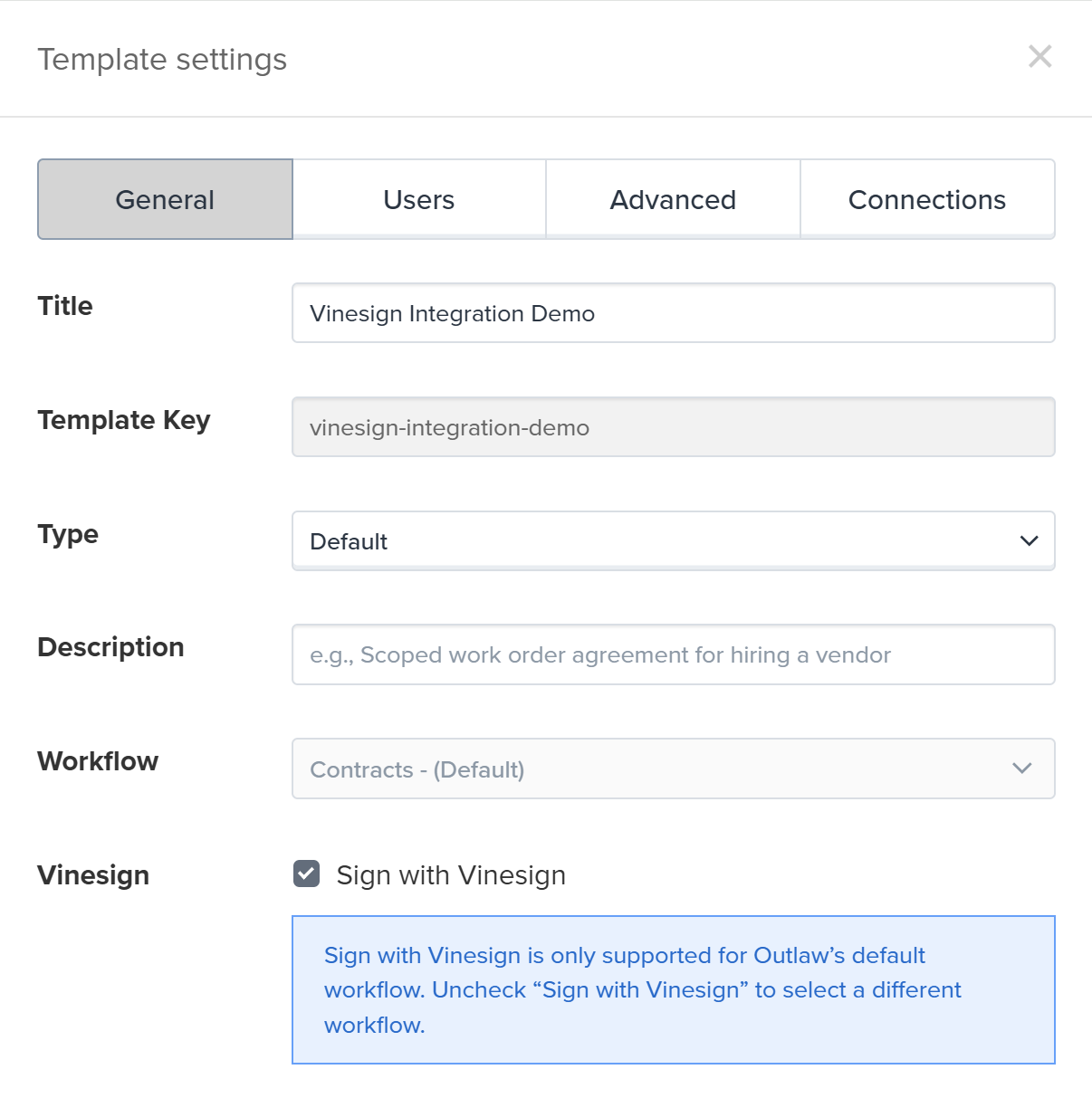 Vinesign can only be used for the Signing step on Outlaw’s default 5-step workflow, and cannot be used with Custom Workflows.