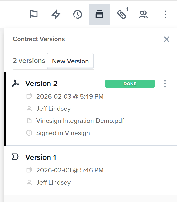 Progressing to the Signing stage will automatically send the document to Vinesign and notify the parties designated in the Signature Blocks. Once all parties have signed, a PDF of the document is automatically added to the .vine as a new version.