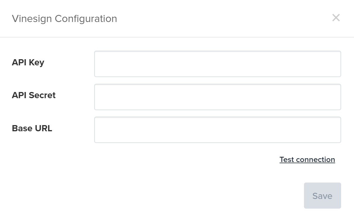 Copy the API Key and Secret from Vinesign, then copy the App URL into the Base URL field, which should be in the format https://api.[yourVinesignInstance].vinesign.com.