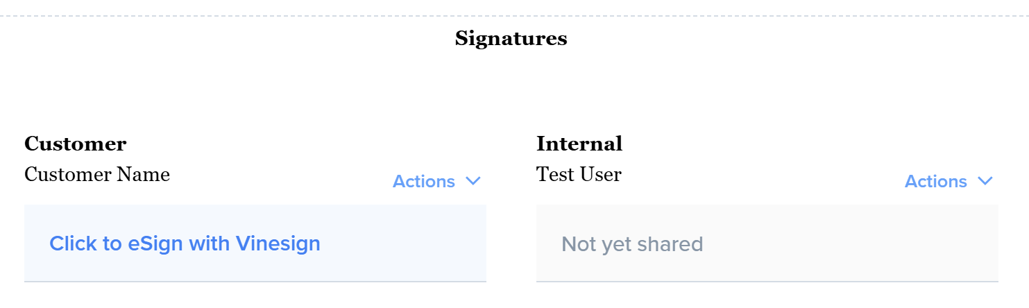 When Vinesign is enabled in a template, the documents created from that template will display “Click to eSign with Vinesign” in the Signature Block.